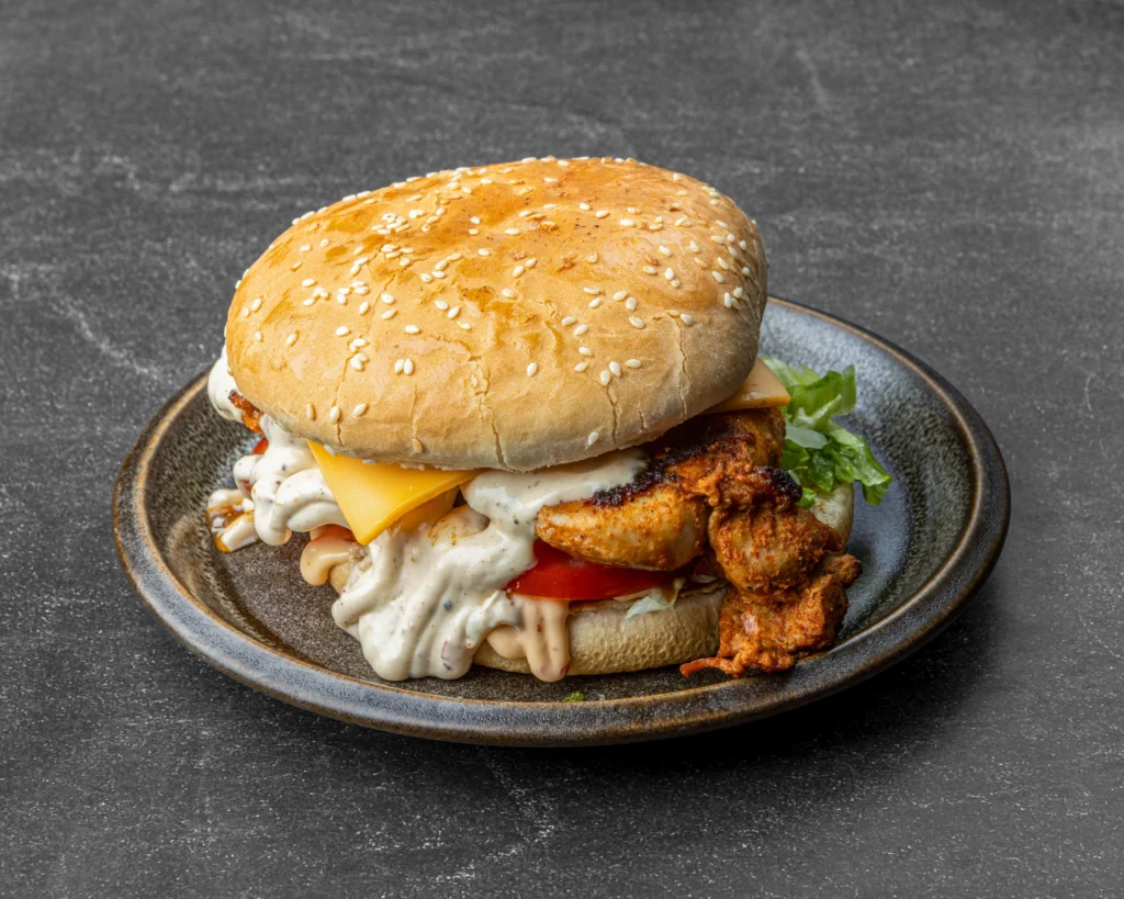 Lettuce, Tomato, Cheese, Grilled Malai Chicken, Peri Peri, Garlic Aoili